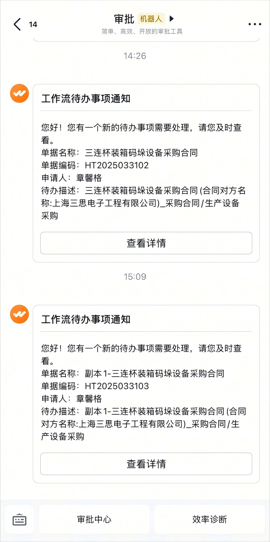 1. 飞书审批机器人可实时获取待办消息,点击待办可直接查看详情。