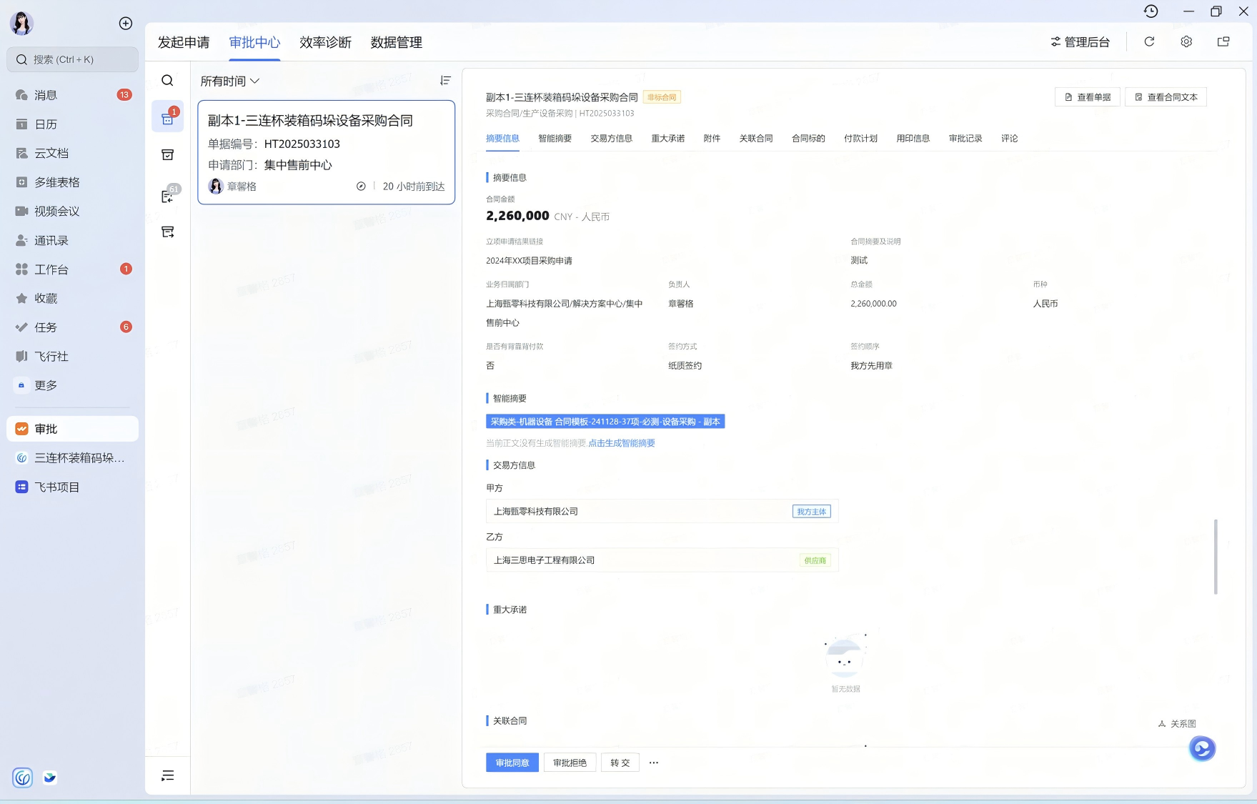 4. PC端可通过飞书审批中心,完成合同审批操作。
