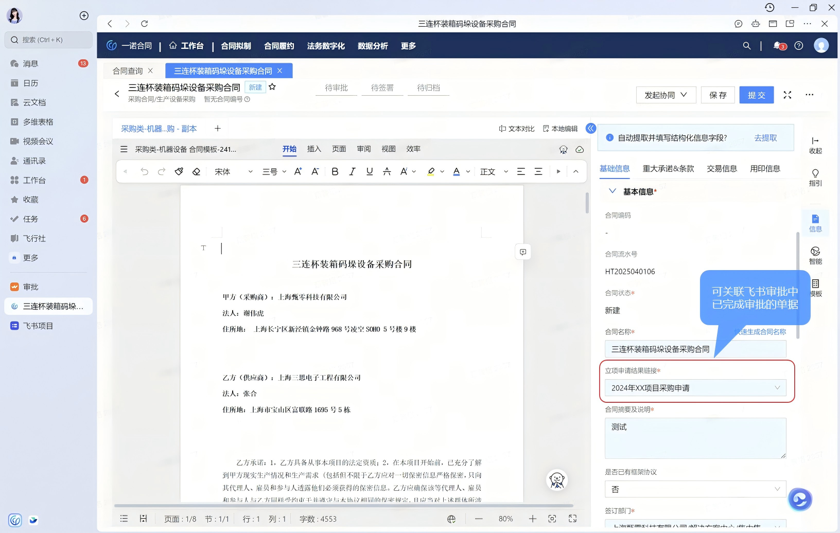 飞书审批关联合同单据,为后续业务流程提供信息支持